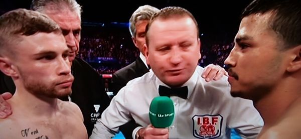 Then, he exploded. Frampton went at Avalos manically, pinning him to the ropes and swinging with the home crowd roar as the contender looked hurt. Avalos was complaining about a shoulder injury but the ref had waved to fight away and Carl took no mercy on his opposite number who had no excuse to turn his back mid-fight.
