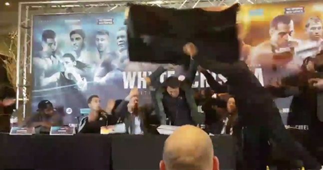 But nobody could have expected the sudden table-throw that came when Chisora lost his temper and decided to hurl the heaviest thing in arm’s reach at his foe sat eight feet away.