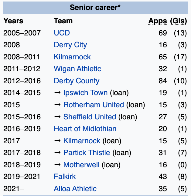 Which Irish Premier League player's career is this?