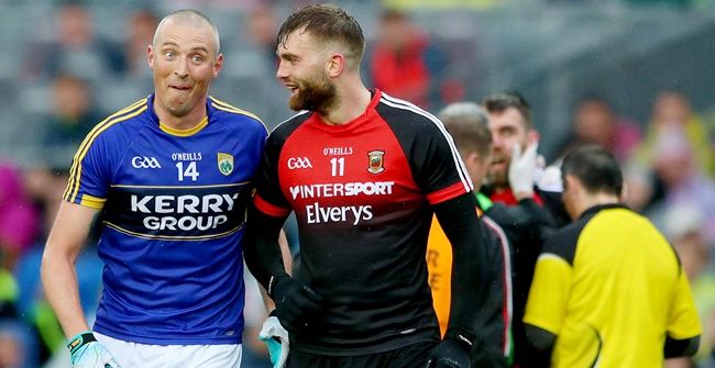 Basketballers battle! Aidan O'Shea gets better of Kieran Donaghy in this instance. Fascinating battle #KerryvMayohttps://t.co/3k6wEAIj4H pic.twitter.com/Z9LKvodJH9