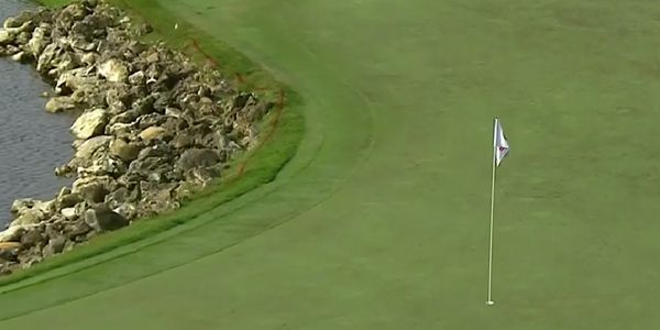 He was approaching the par 4 18th when his initial shot seemed to go wildly off course. It looked like he would be going in the drink when the ball hit a rock… and then another to land just few feet from the pin.