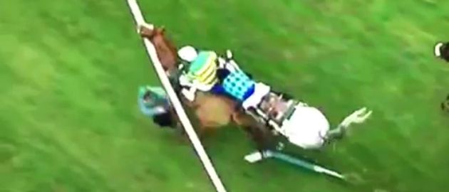 Towards the end of the Cross Country Chase today, French horse Toutancarmont pushed Quantitativeeasing through the running rail and sent this poor soul crashing to the ground.