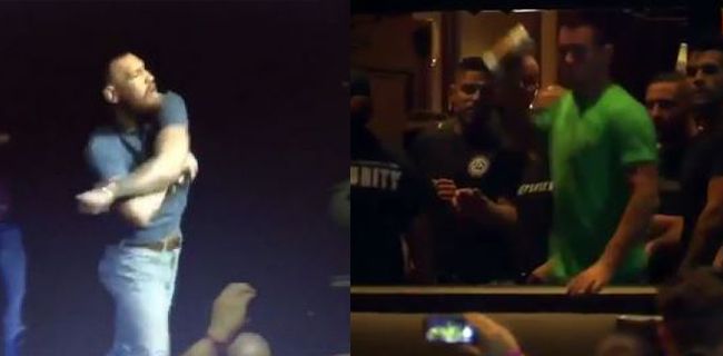 Shields was part of Diaz’s entourage, so when the beverages started flying, he got in on the action, picked up a cup of coffee and milled it down from the crowd towards team McGregor.