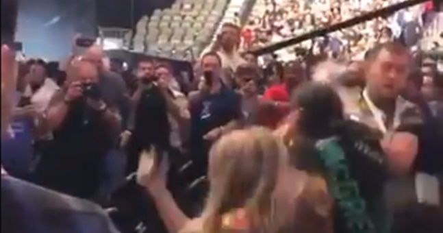 Tensions were high between the two fighters and that atmosphere seemingly spilled into the seated area with a man wearing a Conor McGregor Reebok designed t-shirt fighting another man who launched a chair at him.