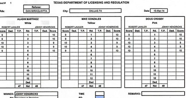 So, let’s say that in a three round fight a wrestler is taking on a kickboxer and the wrestler completes three undefended takedowns in each round but that the striker is clearly dominant in the striking stakes. The wrestler finishes the fight with 30 points under the grappling column while his opponent might be awarded 27 or lower (9 in each round) in that realm while the kickboxer gets a similar scorecard for striking.