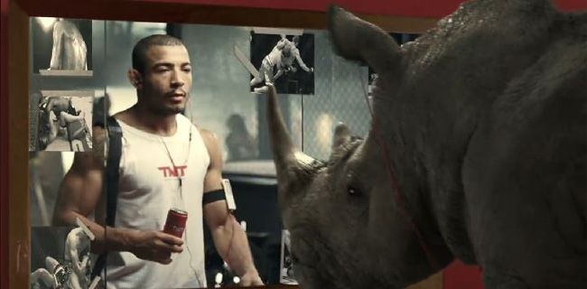 An ad for energy drink featuring Jose Aldo has been doing the rounds on social media, and it really is quite a sight to behold. Despite being the celebrity in the clip, Aldo really isn’t the star of this show. The Brazilian’s thunder is stolen in the video by a massive CGI rhino (well we assume it is CGI), which dominates the screen time.