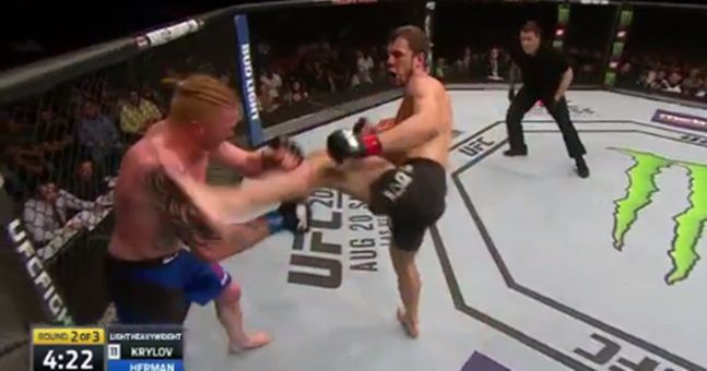 WHAT A FINISH! @KrylovUFC puts @EdHermanufc down! #UFC201 https://t.co/pjVwy5mH61