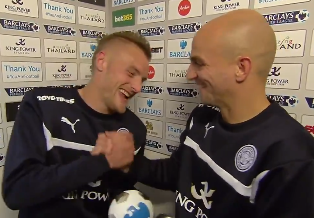 Name the Leicester player presenting Jamie Vardy with his man of the match award after his first Premier League goal here?