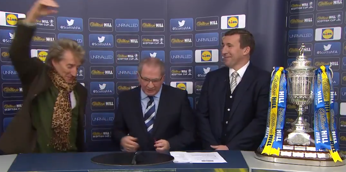 Name the former Everton and Celtic player on the right, who watched a giddy Rod Stewart perform the Scottish Cup draw in 2016?