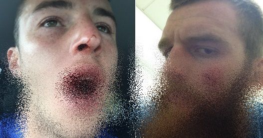 We don’t know the intricacies of what happened but it’s safe to say that the lip of out-half Steve Shingler was clattered by the cheek of second-row Jake Ball and it’s easy to see who came out second best.