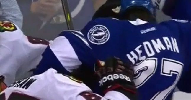 During the first game of the Stanley Cup final last night, a scrap broke out behind the goal between Tampa Bay Lightning’s Victor Hedman and Chicago Blackhawks’ Patrick Kane.
