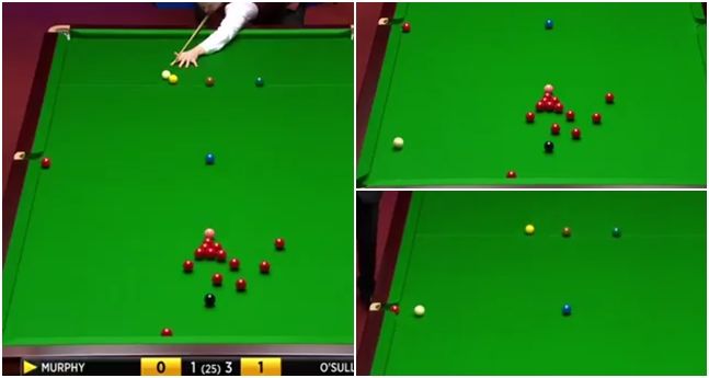 Early in the frame, a red was on the edge of the middle pocket, but the 2005 world champion was unable to directly hit it. So, he played the cue ball off three cushions, came back up the table and pot the red.